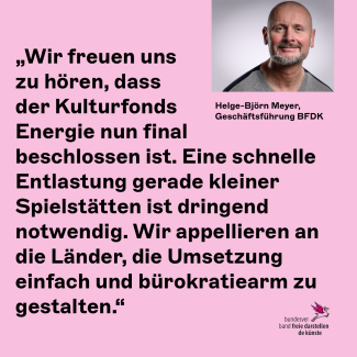 Das Portal für die Antragstellung im Kulturfonds Energie ist ab sofort online: https://www.kulturfonds-energie.de/ Anträge auf Unterstützung bei den Energiekosten können bereits angelegt, jedoch noch nicht abgeschickt werden. Die Antragsvoraussetzungen sind derzeit noch vorläufig bis zur finalen Zustimmung des Finanzministeriums.